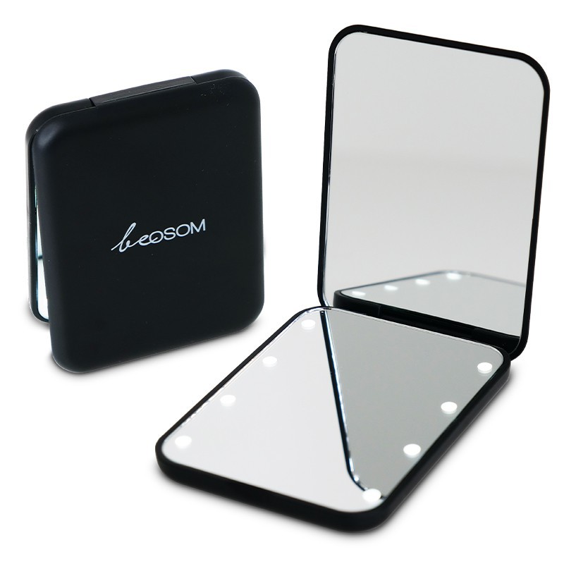 Šis „Be Osom“ veidrodėlis turi 8 ryškias LED lemputes, įtaisytas apatinio veidrodžio šonuose. Viršutinis veidrodis yra didinantis, o apatinis paprastas. Veidrodėlį įjungsite ir išjungsite patogiu jungtuku prietaiso nugarėlėje. Į vidų dedamos dvi plokščios „tabletės“ tipo baterijos. Šis veidrodėlis yra itin kompaktiškas, lengvas ir patogus nešiotis rankinėje.
